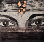2021Ets, droge naald, aquatint met sjabloondruk Uit mondkapjes-serie in het kader van de Corona pandemie.