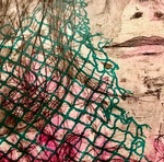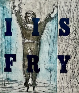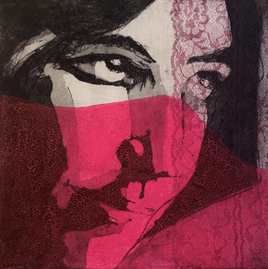 2021Ets, droge naald, aquatint met sjabloondruk Uit mondkapjes-serie in het kader van de Corona pandemie.