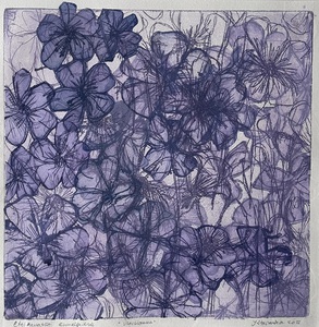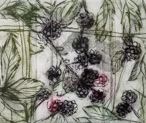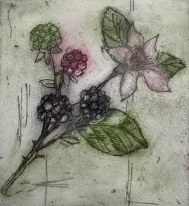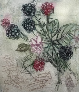 2021Etsen van bramen in een vaas. Geinspireert op herinneringen van bramen bij het woudhuisje van mij overgrootmoeder.