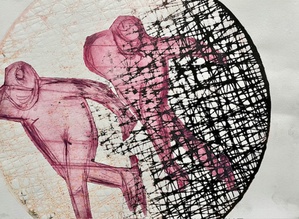 2021Ets, aquatint, droge naald / sjabloondruk. Inzending voor internationale tentoonstelling Turkijje Uit de mondkapjes-serie in het kader van de Corona pandemie.